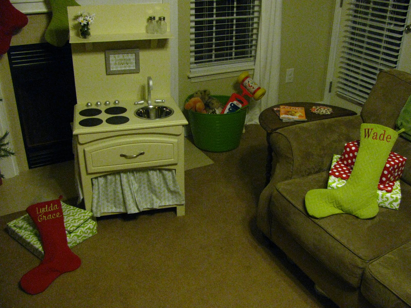 Way back before we moved I stumbled upon a nightstand for $5 at a yard sale that was just right for the base. With some scrap lumber from Home Depot ($3), stainless dog bowl from Goodwill ($2), sawing help and drill usage from friends (free), paint ($7), fabric ($4), and various odd hinges, wooden knobs, and other accessories (about $6) we ended up with this sweet kitchen that Lydda Grace loves! It was so fun to see her reaction when we gave it to her (kind of stunned and shy... and then she dove right into playing with it). We're hoping she and Wade will get lots of fun from it, not to mention how much fun Jon and I had making it!1.02.2011